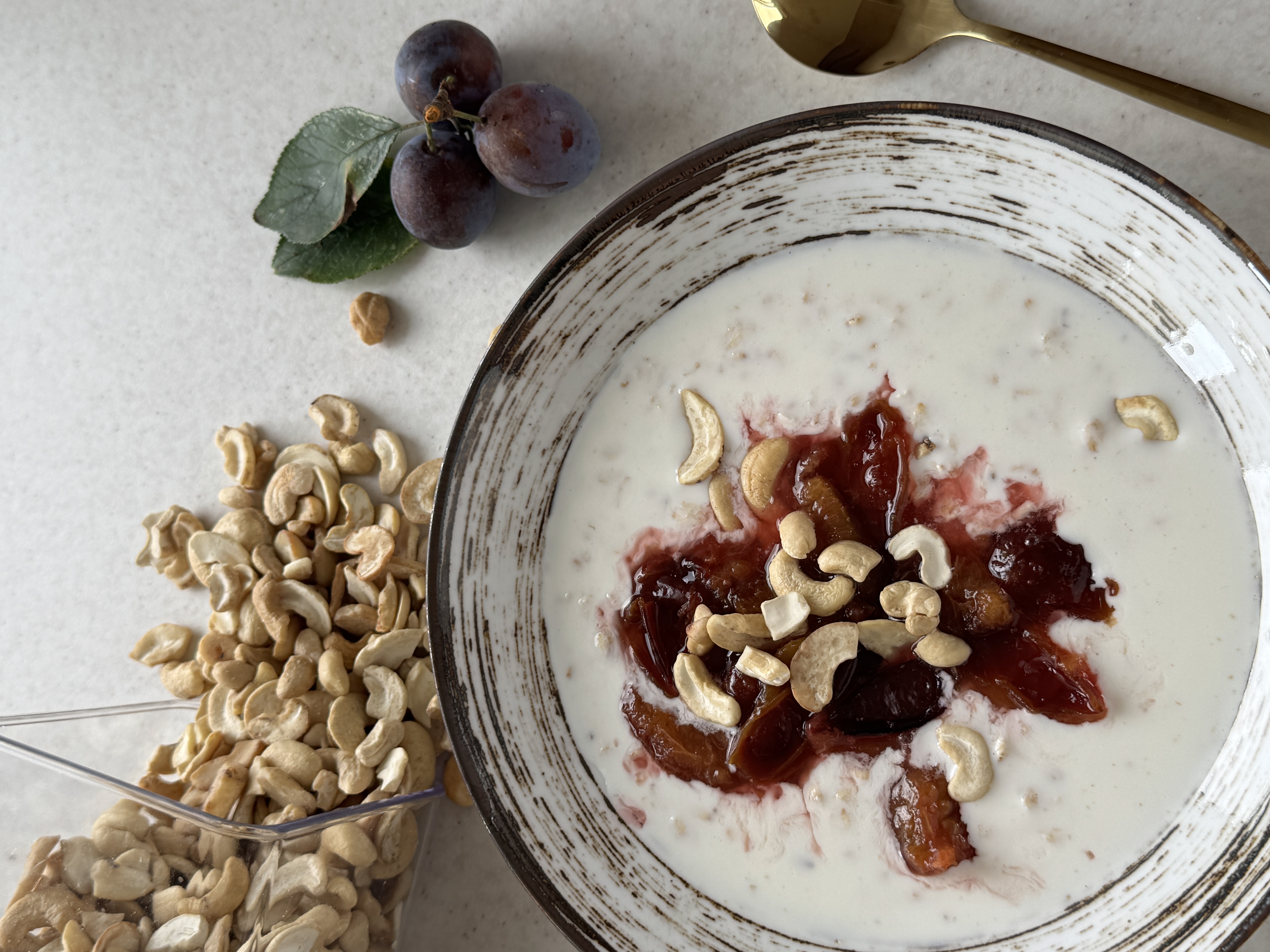 Nocna owsianka ze śliwkami, cynamonem i orzechami nerkowca – zdrowe śniadanie pełne smaku